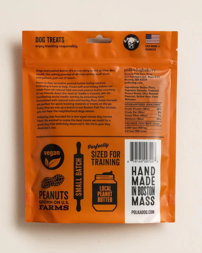 Formulated with all-natural, peanut butter from none other than Teddie's Peanut Butter in Everett, MA, these POLKA DOG Wonder Nuggets are soft, easy on the stomach, and ideally sized for training rewards or quick treats on the go.